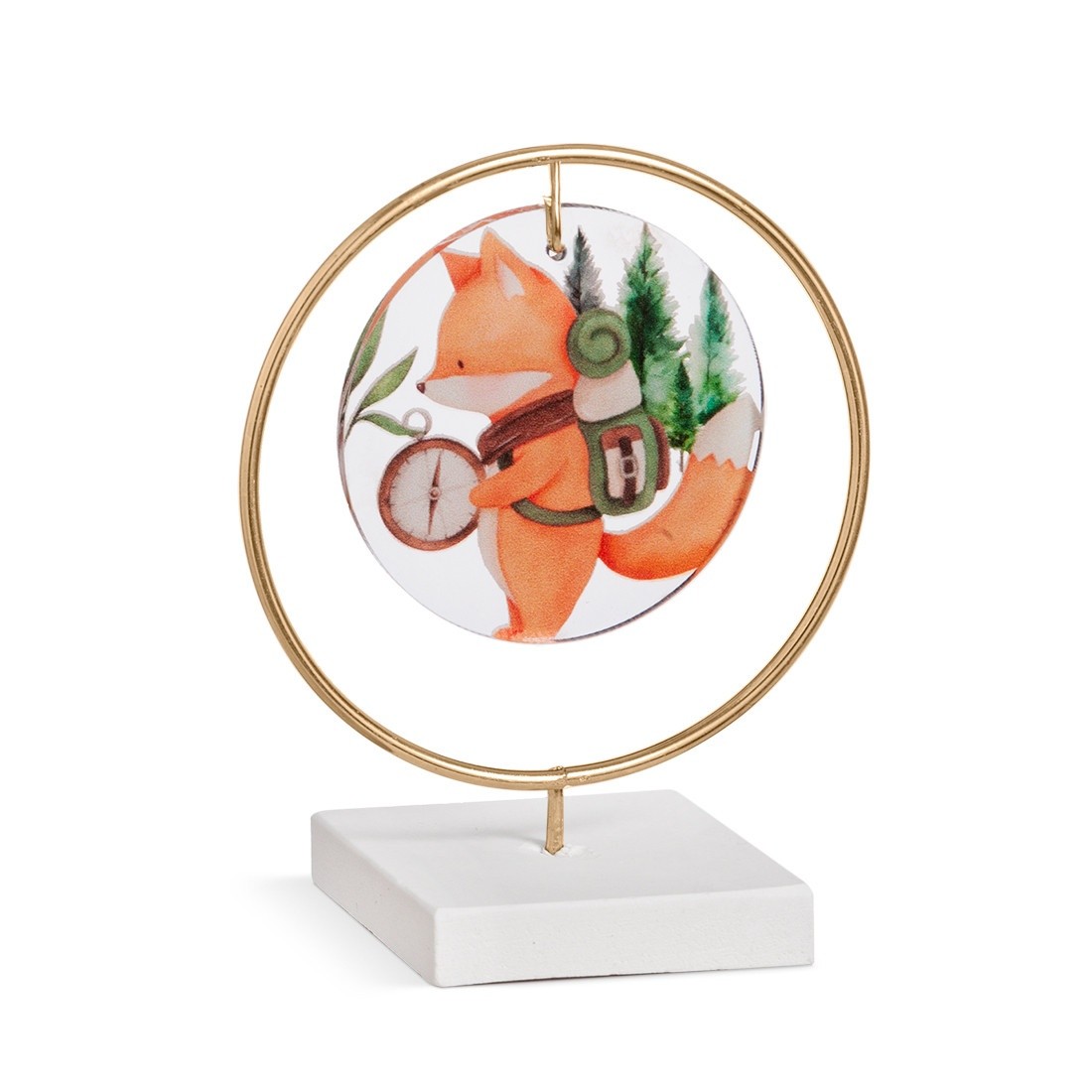 Διακοσμητική μπομπονιέρα με σύνθεση τριών υλικών.Η σύνθεση αποτελείται από : α) στρογγυλή print plexiglass παράσταση σε διάφανο χρώμα β) μεταλλικό κρίκο σε χρυσό χρώμα γ)βάση. Η παράσταση απεικονίζει την αλεπού να πηγαίνει camping.