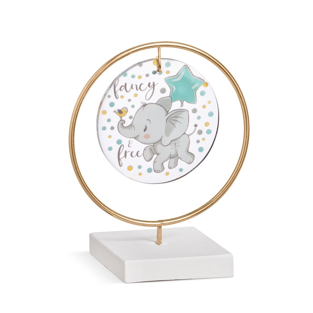 Διακοσμητική μπομπονιέρα με σύνθεση τριών υλικών.Η σύνθεση αποτελείται από : α) στρογγυλή print plexiglass παράσταση σε διάφανο χρώμα β) μεταλλικό κρίκο σε χρυσό χρώμα γ)βάση. Η παράσταση απεικονίζει το ελεφαντάκι με το μπαλόνι να είναι fancy & free .