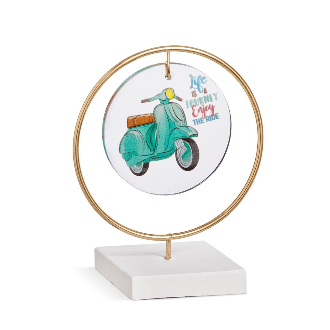 Διακοσμητική μπομπονιέρα με σύνθεση τριών υλικών.Η σύνθεση αποτελείται από : α) στρογγυλή print plexiglass παράσταση σε διάφανο χρώμα β) μεταλλικό κρίκο σε χρυσό χρώμα γ)βάση. Η παράσταση απεικονίζει τη βεραμάν βέσπα και moto "Life is a journey, enjoy the ride".