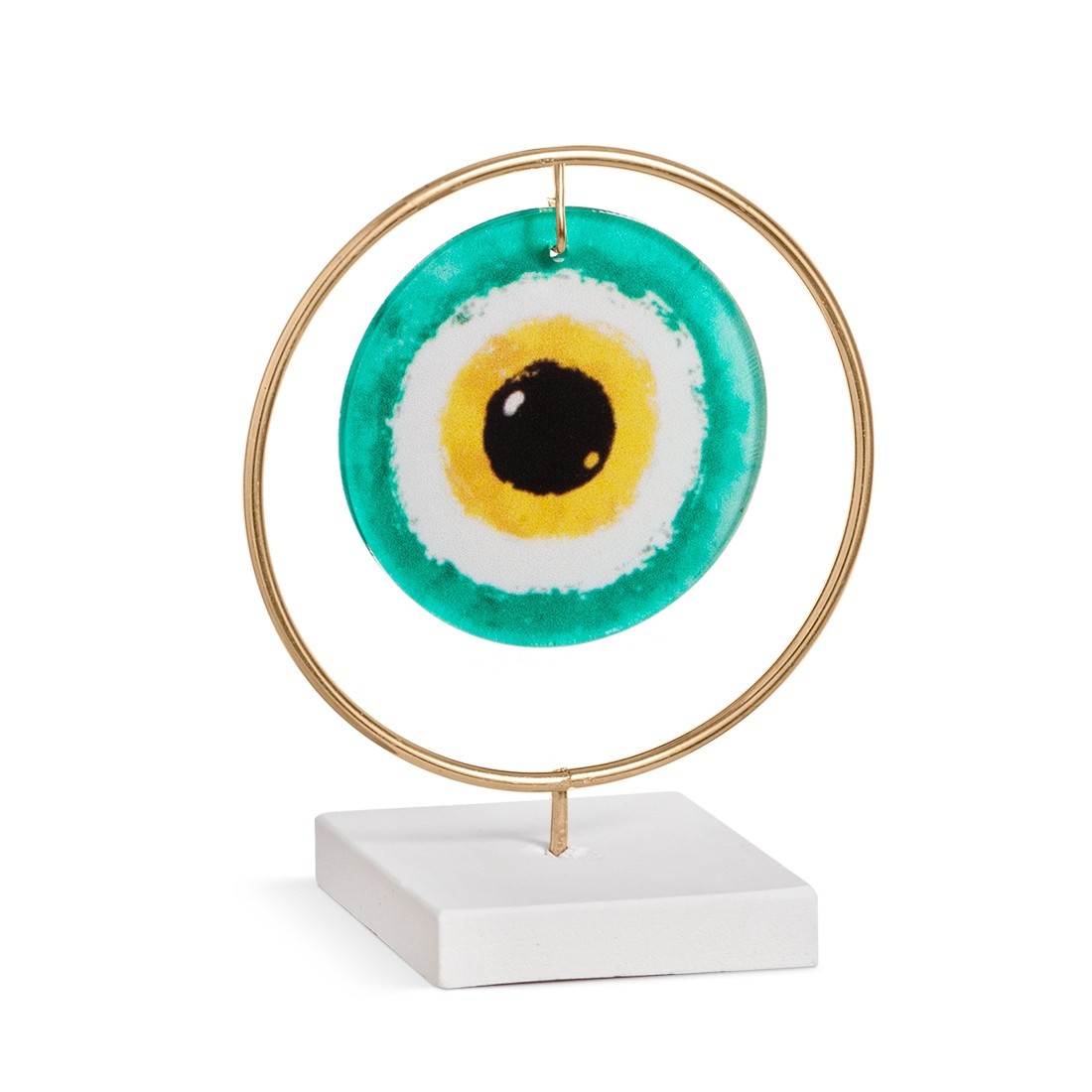 Διακοσμητική μπομπονιέρα με σύνθεση τριών υλικών.Η σύνθεση αποτελείται από : α) στρογγυλή print plexiglass παράσταση σε διάφανο χρώμα β) μεταλλικό κρίκο σε χρυσό χρώμα γ)βάση. Η παράσταση απεικονίζει ένα πράσινο μάτι.