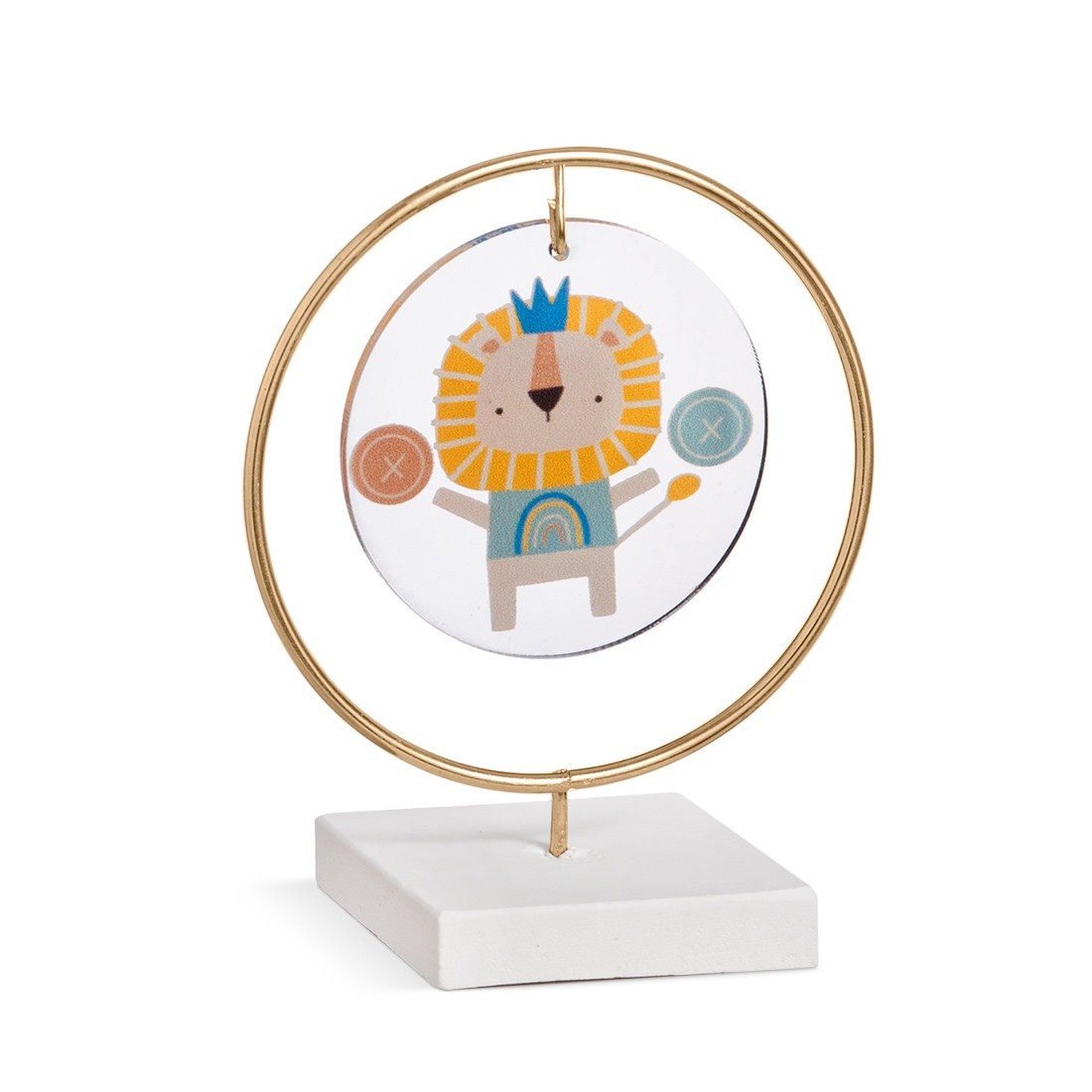 Διακοσμητική μπομπονιέρα με σύνθεση τριών υλικών.Η σύνθεση αποτελείται από : α) στρογγυλή print plexiglass παράσταση σε διάφανο χρώμα β) μεταλλικό κρίκο σε χρυσό χρώμα γ)βάση. Η παράσταση απεικονίζει ένα λιονταράκι σε σιέλ αποχρώσεις .