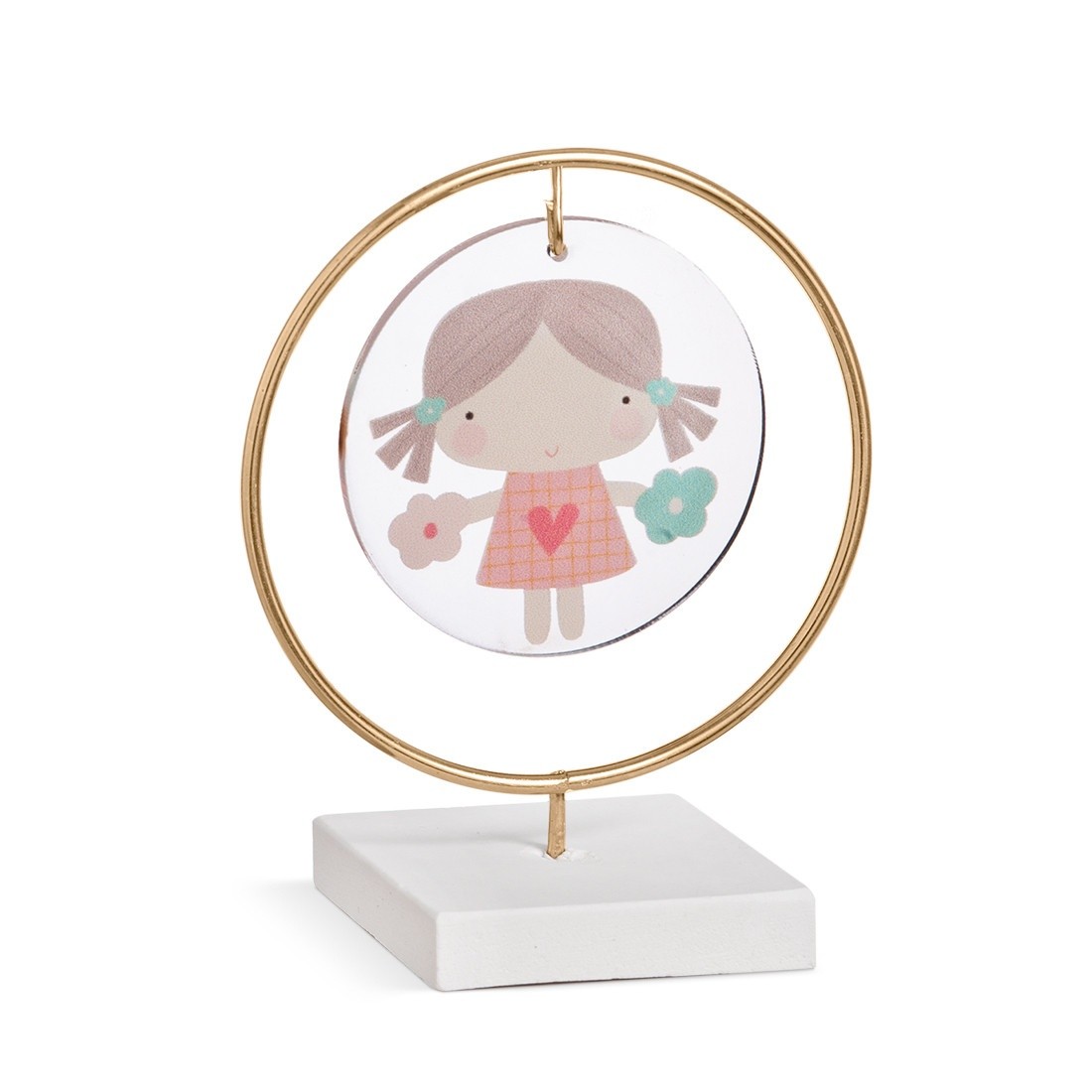 Διακοσμητική μπομπονιέρα με σύνθεση τριών υλικών.Η σύνθεση αποτελείται από : α) στρογγυλή print plexiglass παράσταση σε διάφανο χρώμα β) μεταλλικό κρίκο σε χρυσό χρώμα γ)βάση. Η παράσταση απεικονίζει ένα κοριτσάκι σε ροζ girlish αποχρώσεις .