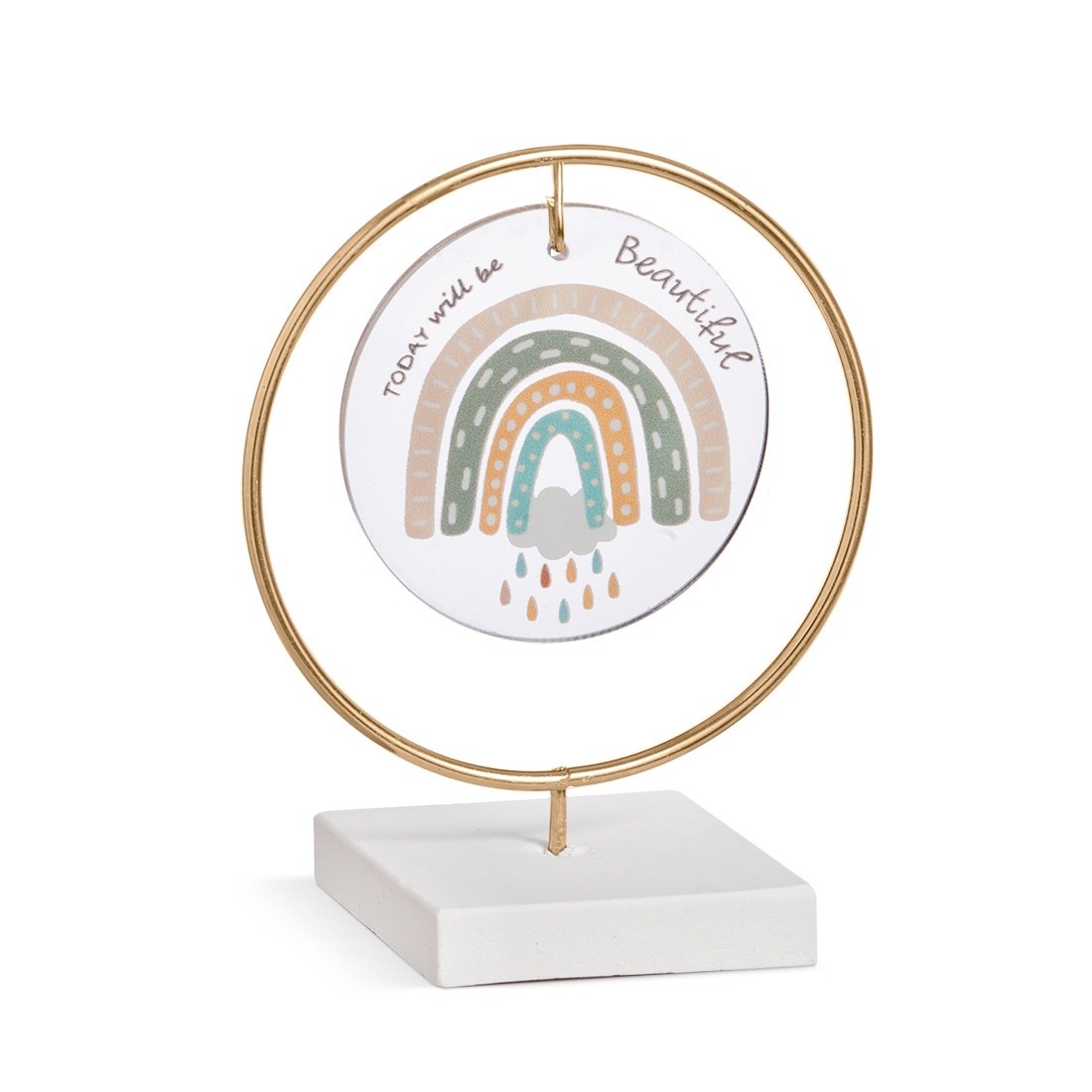Διακοσμητική μπομπονιέρα με σύνθεση τριών υλικών.Η σύνθεση αποτελείται από : α) στρογγυλή print plexiglass παράσταση σε διάφανο χρώμα β) μεταλλικό κρίκο σε χρυσό χρώμα γ)βάση. Η παράσταση απεικονίζει το ουράνιο τόξο μετά τη βροχή και moto "Today wil be beautiful".
