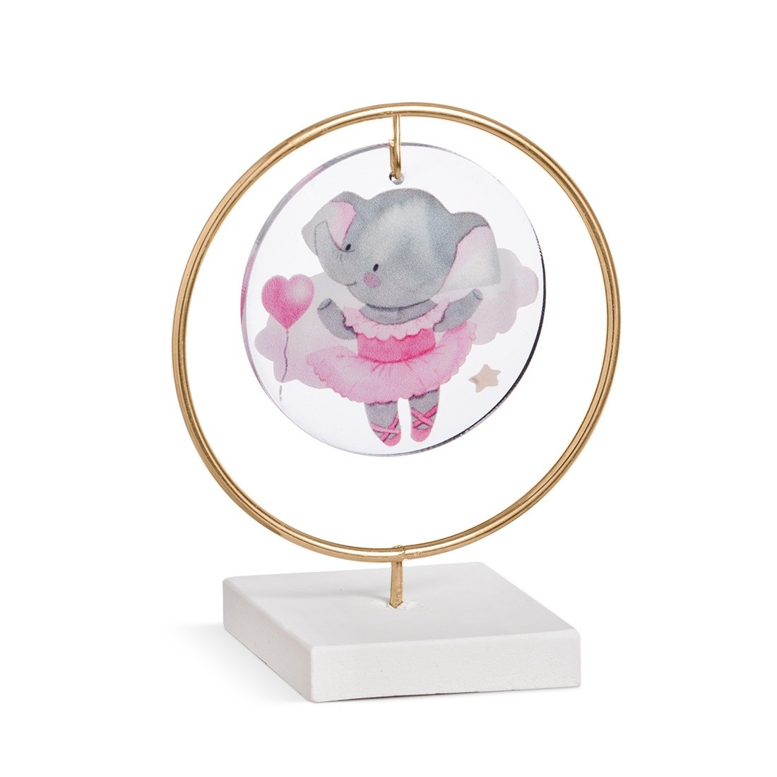 Διακοσμητική μπομπονιέρα με σύνθεση τριών υλικών.Η σύνθεση αποτελείται από : α) στρογγυλή print plexiglass παράσταση σε διάφανο χρώμα β) μεταλλικό κρίκο σε χρυσό χρώμα γ)βάση. Η παράσταση απεικονίζει την ελεφαντίνα μπαλαρίνα σε ροζ αποχρώσεις .