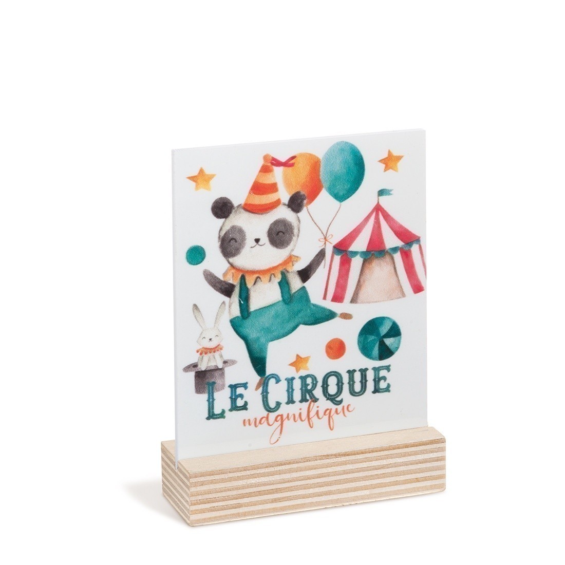 Ξύλινη βάση με παραλληλόγραμμο print καδράκι σε λευκό plexiglass. Η παράσταση απεικονίζει το panda να κάνει ακροβατικά με φόντο τη σκηνή του τσίρκου.