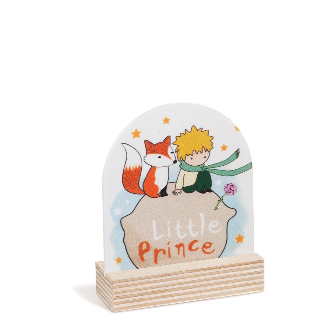 Ξύλινη βάση με print plexiglass σε σχήμα οβάλ. Η παράσταση απεικονίζει σε λευκό χρώμα την κλασσική φιγούρα του Μικρού Πρίγκιππα από το παραμύθι.
