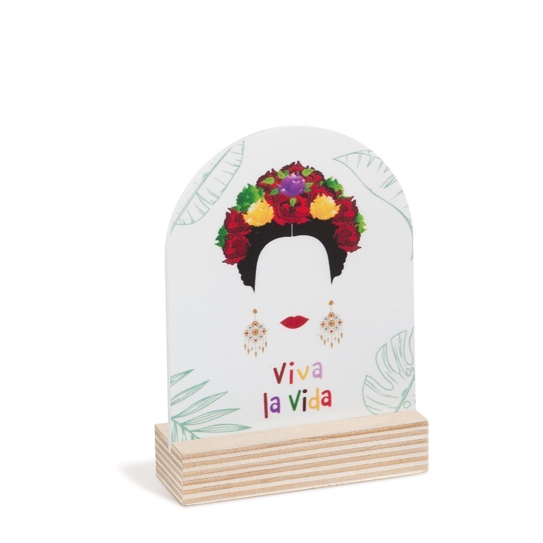 Ξύλινη βάση με print plexiglass σε σχήμα οβάλ. Η παράσταση απεικονίζει σε λευκό χρώμα την Frida Khalo και moto " Viva la vida".