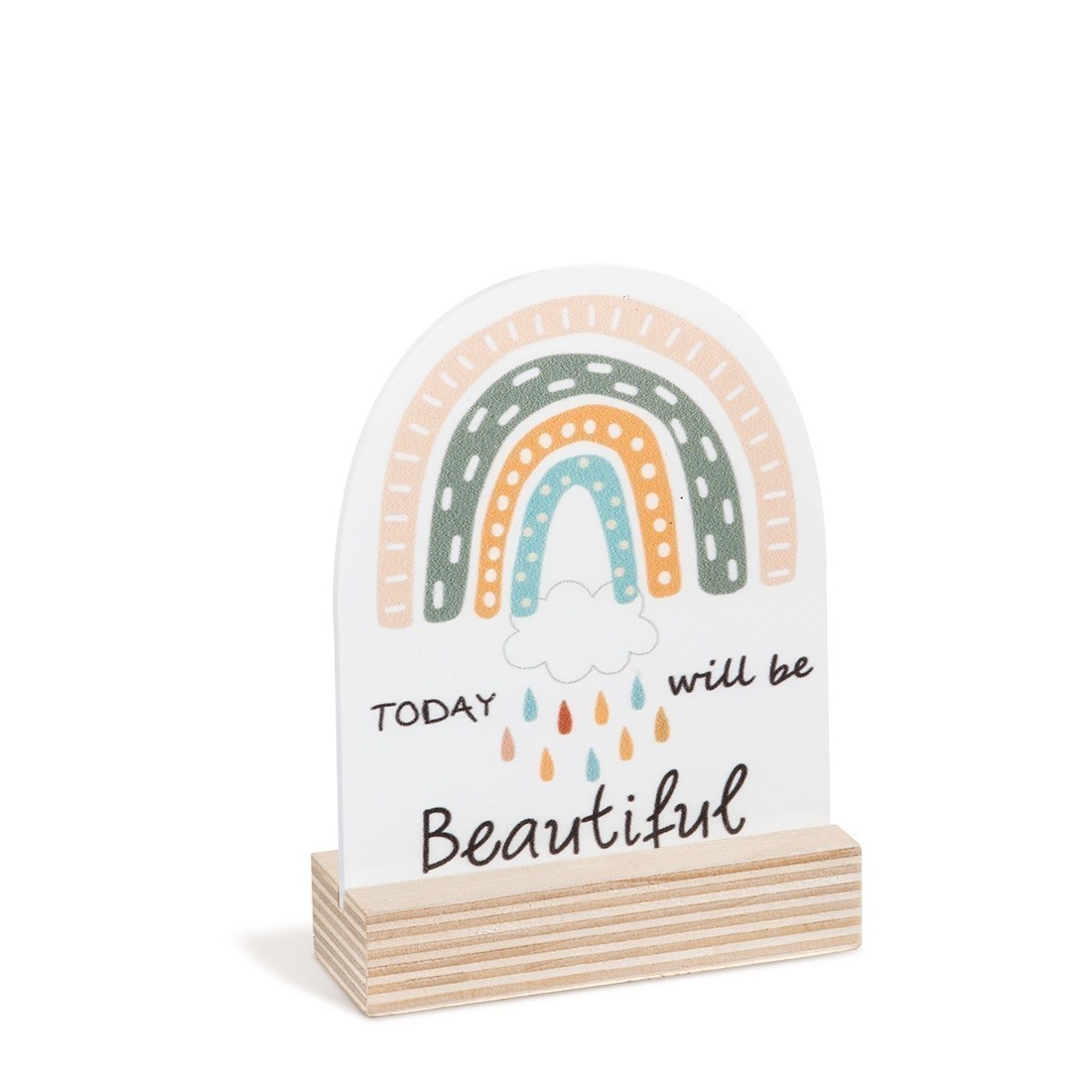 Ξύλινη βάση με print plexiglass σε σχήμα οβάλ. Η παράσταση απεικονίζει σε λευκό χρώμα το ουράνιο τόξο μετά τη βροχή και moto "Today wil be beautiful".