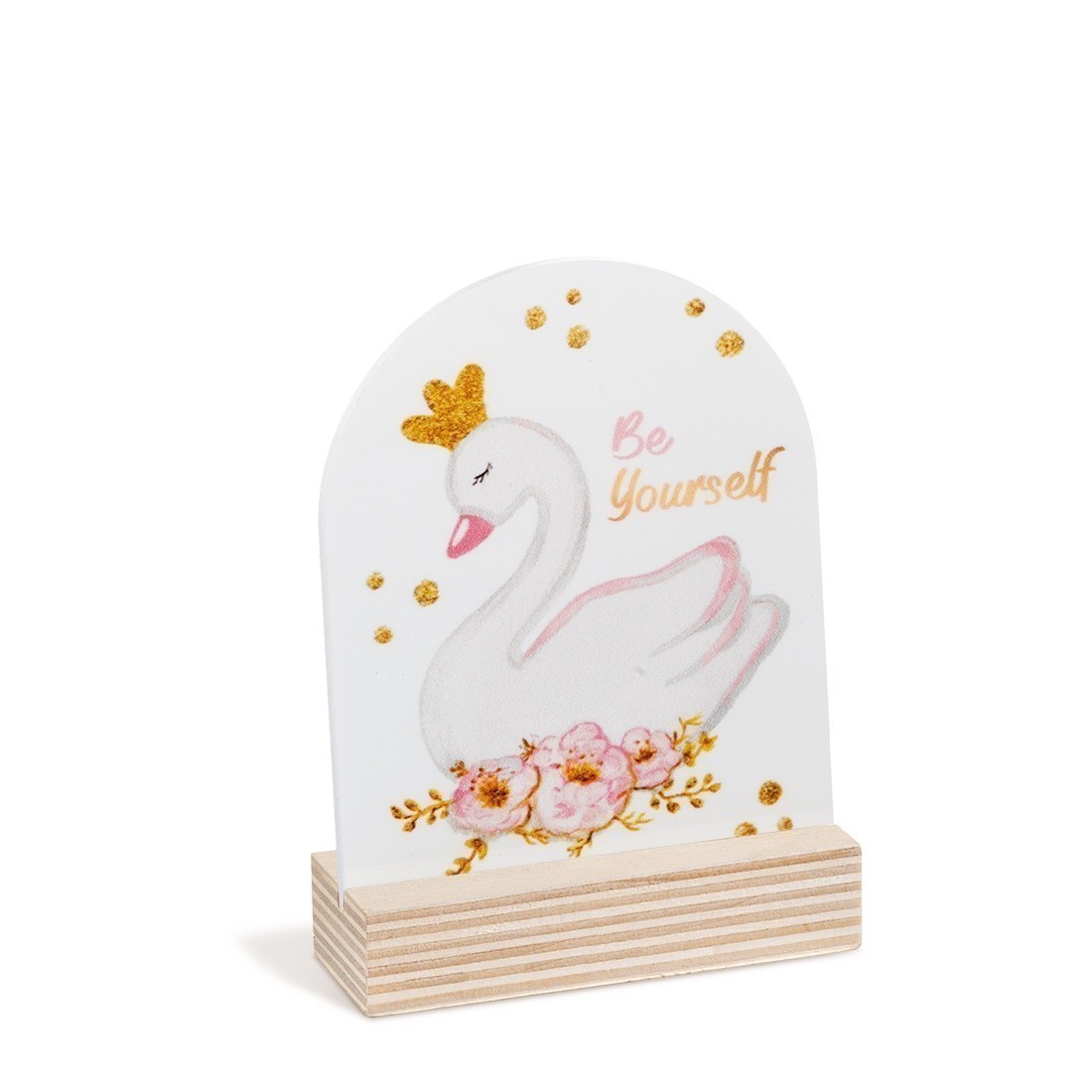 Ξύλινη βάση με print plexiglass σε σχήμα οβάλ. Η παράσταση απεικονίζει σε λευκό χρώμα τον κύκνο.
