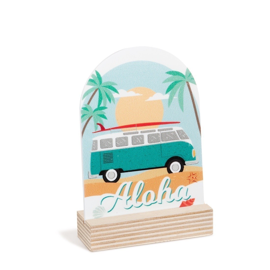 Ξύλινη βάση με print plexiglass σε σχήμα οβάλ. Η παράσταση απεικονίζει σε λευκό χρώμα ένα βεραμάν van ALOHA.
