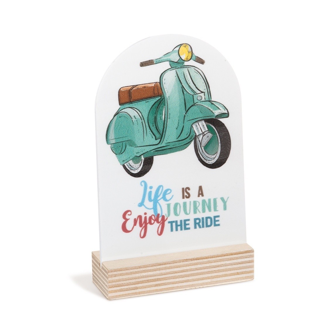 Ξύλινη βάση με print plexiglass σε σχήμα οβάλ. Η παράσταση απεικονίζει σε λευκό χρώμα τη βεραμάν βέσπα και moto "Life is a journey, enjoy the ride".