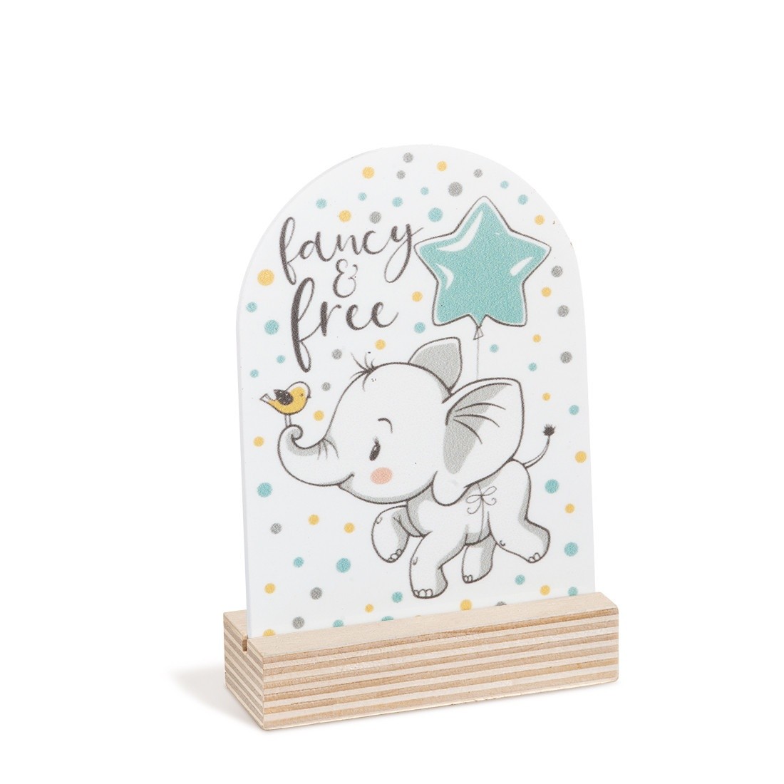 Ξύλινη βάση με print plexiglass σε σχήμα οβάλ. Η παράσταση απεικονίζει σε λευκό χρώμα το ελεφαντάκι με το μπαλόνι να είναι fancy & free.