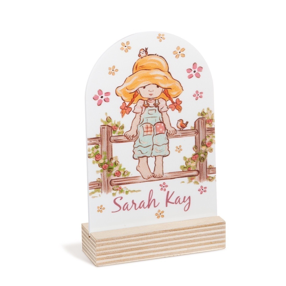 Ξύλινη βάση με print plexiglass σε σχήμα οβάλ. Η παράσταση απεικονίζει σε λευκό χρώμα την Sarah Kay στο φράχτη.