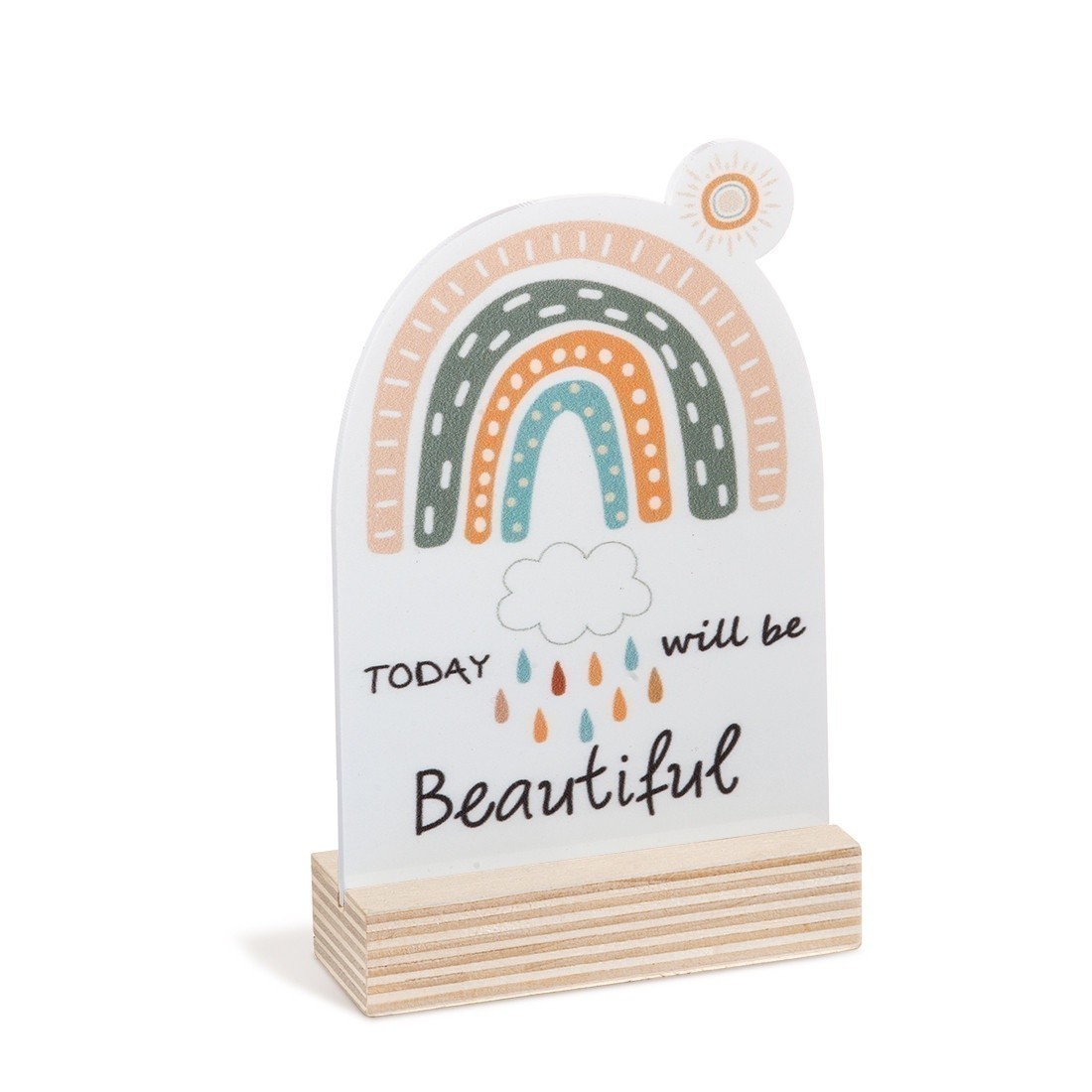 Ξύλινη βάση με print plexiglass κοπτικό. Η παράσταση απεικονίζει σε λευκό χρώμα το ουράνιο τόξο μετά τη βροχή και moto "Today wil be beautiful" .
