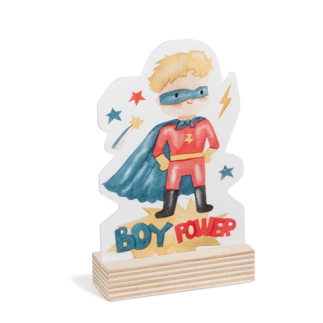 Ξύλινη βάση με print plexiglass κοπτικό. Η παράσταση απεικονίζει σε λευκό χρώμα το Super boy Power .