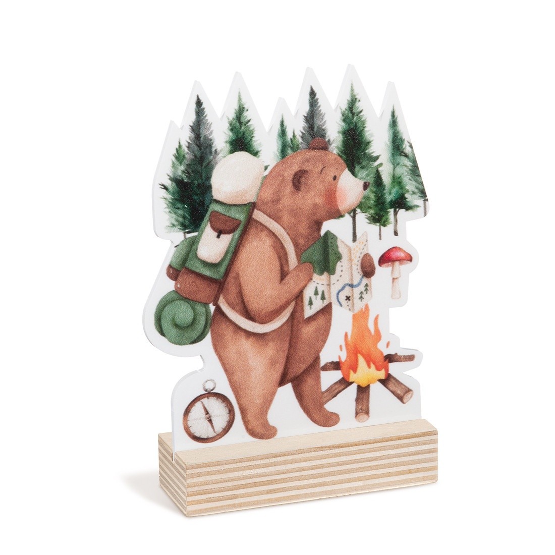 Ξύλινη βάση με print plexiglass κοπτικό. Η παράσταση απεικονίζει σε λευκό χρώμα την αρκούδα να πηγαίνει για camping .