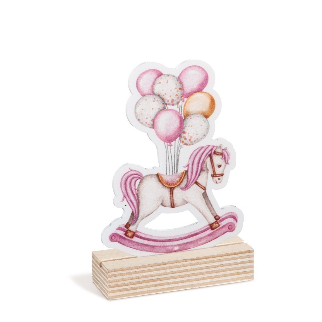 Ξύλινη βάση με print plexiglass κοπτικό. Η παράσταση απεικονίζει σε λευκό χρώμα ένα ροζ αλογάκι με μπαλόνια .
