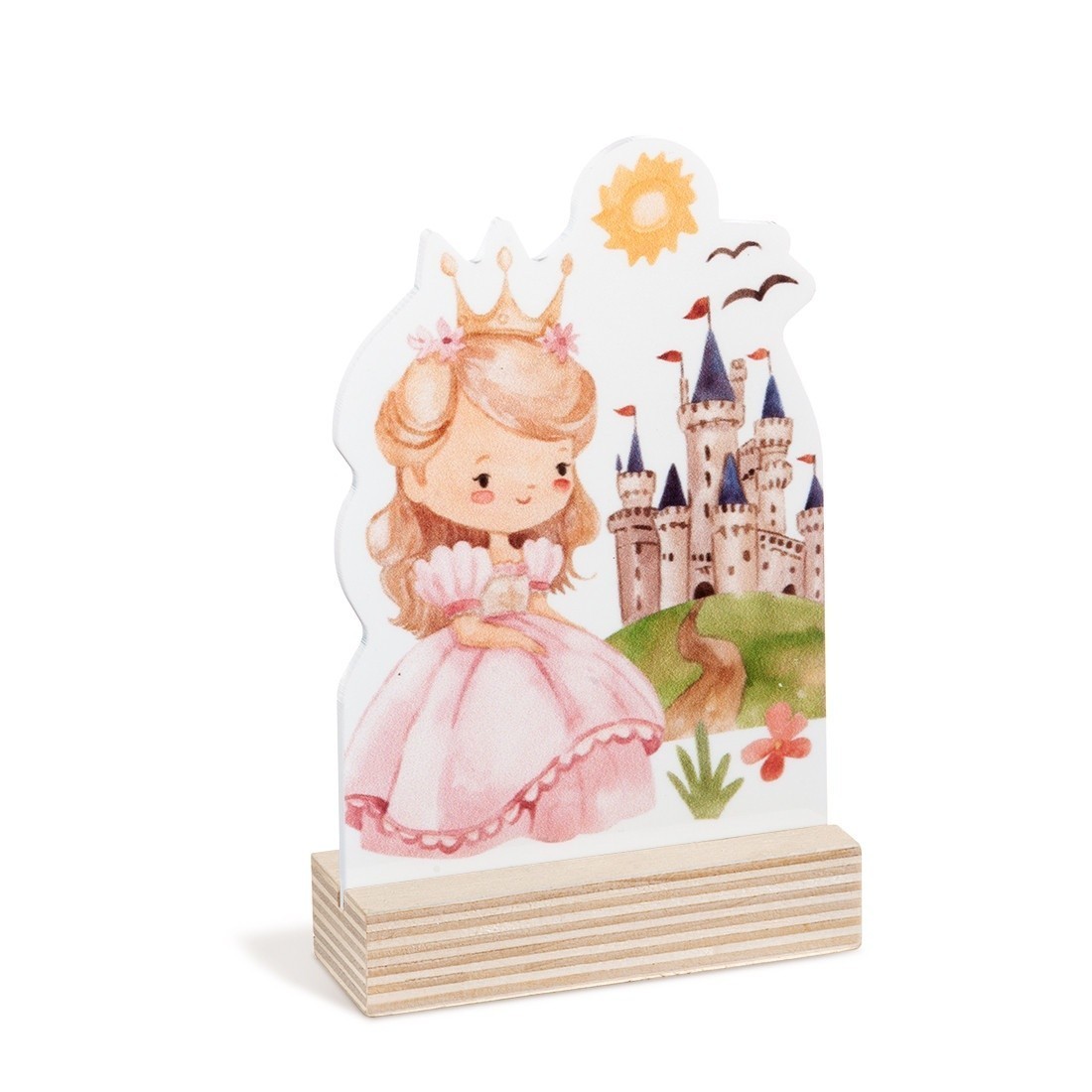 Ξύλινη βάση με print plexiglass κοπτικό. Η παράσταση απεικονίζει σε λευκό χρώμα την πριγκίπισσα του παραμυθιού με φόντο το κάστρο .