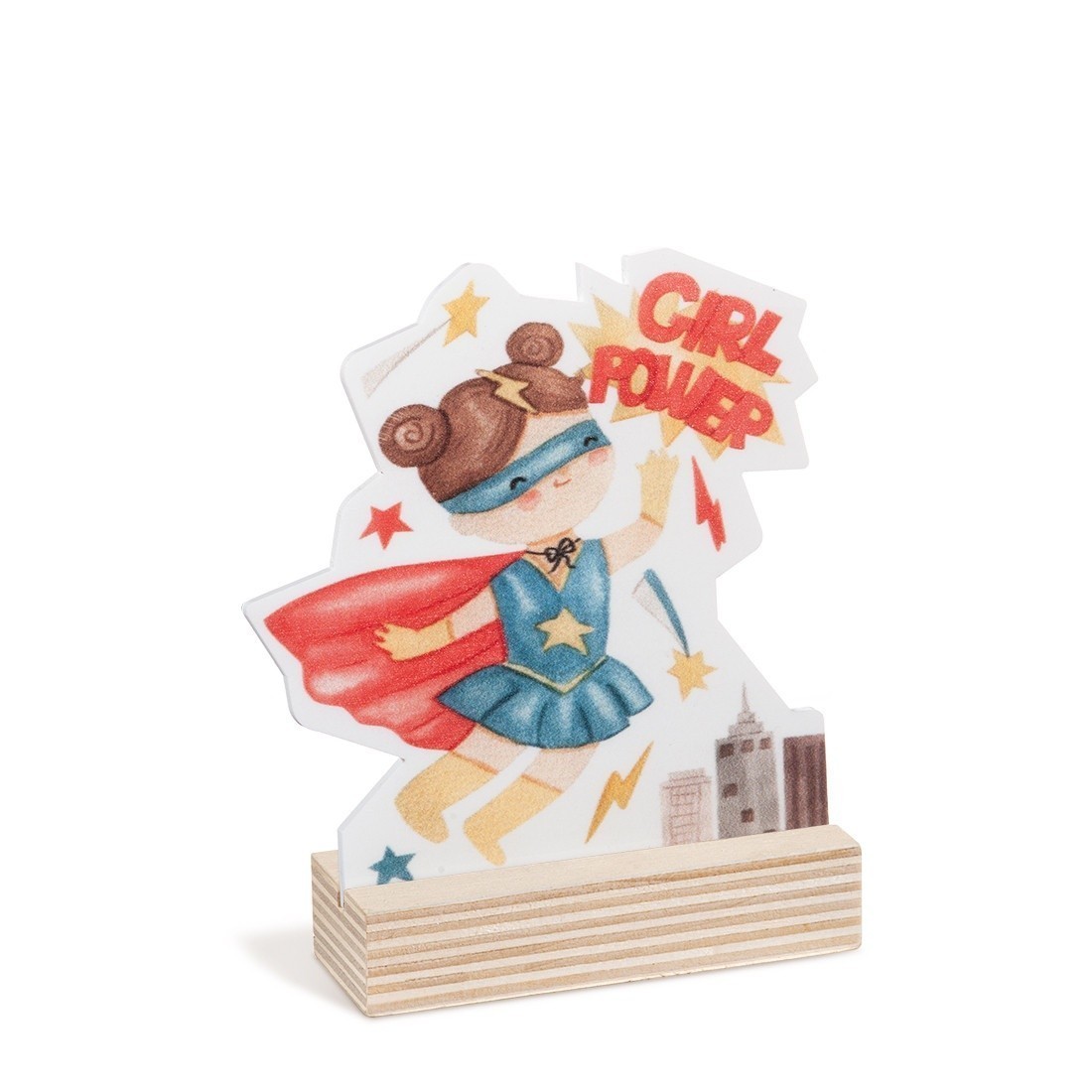 Ξύλινη βάση με print plexiglass κοπτικό. Η παράσταση απεικονίζει σε λευκό χρώμα την Super Girl power.