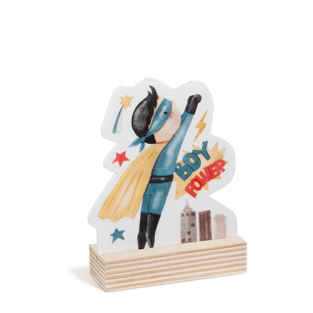 Ξύλινη βάση με print plexiglass κοπτικό. Η παράσταση απεικονίζει σε λευκό χρώμα το Super boy Power .