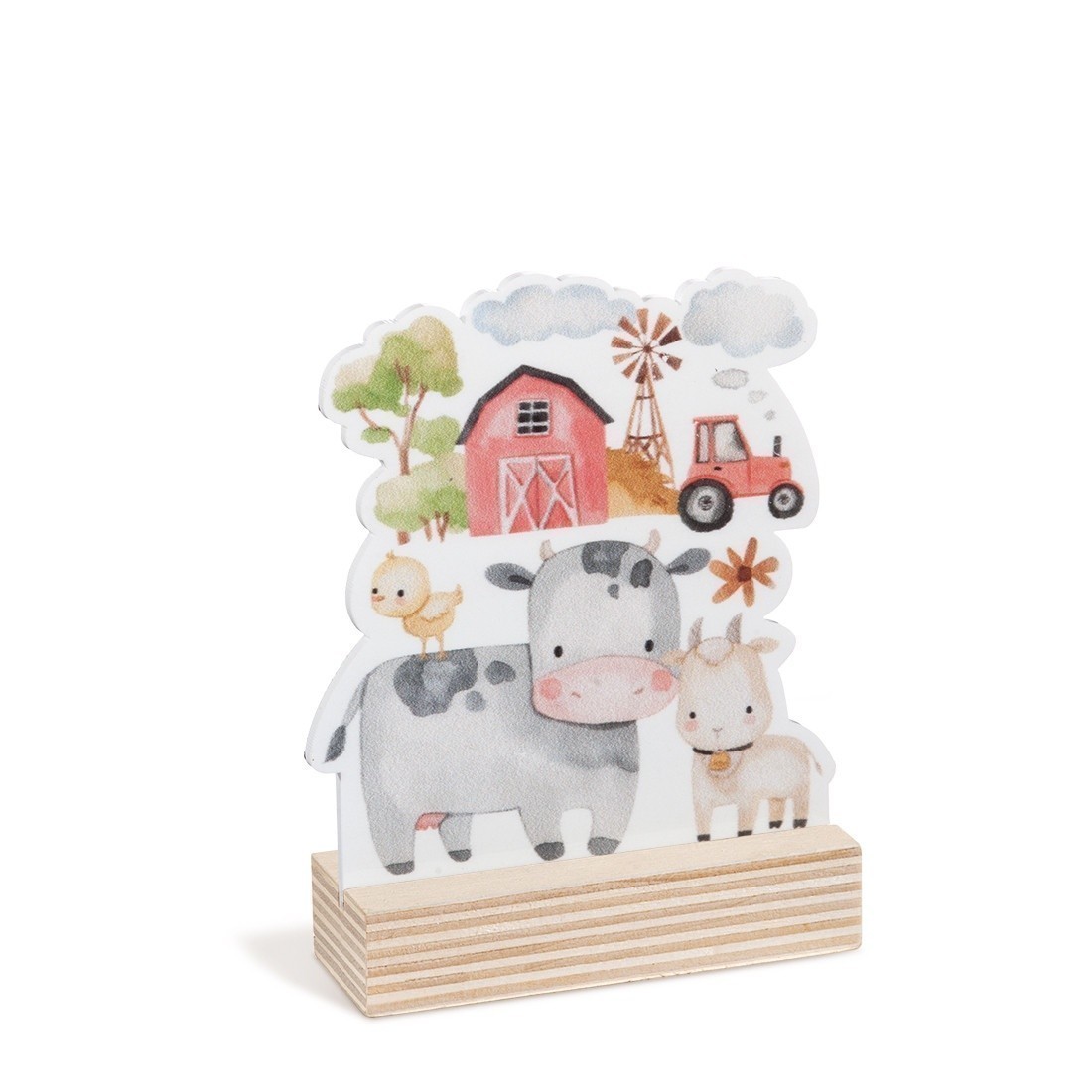 Ξύλινη βάση με print plexiglass κοπτικό. Η παράσταση απεικονίζει σε λευκό χρώμα τα ζωάκια της φάρμας .