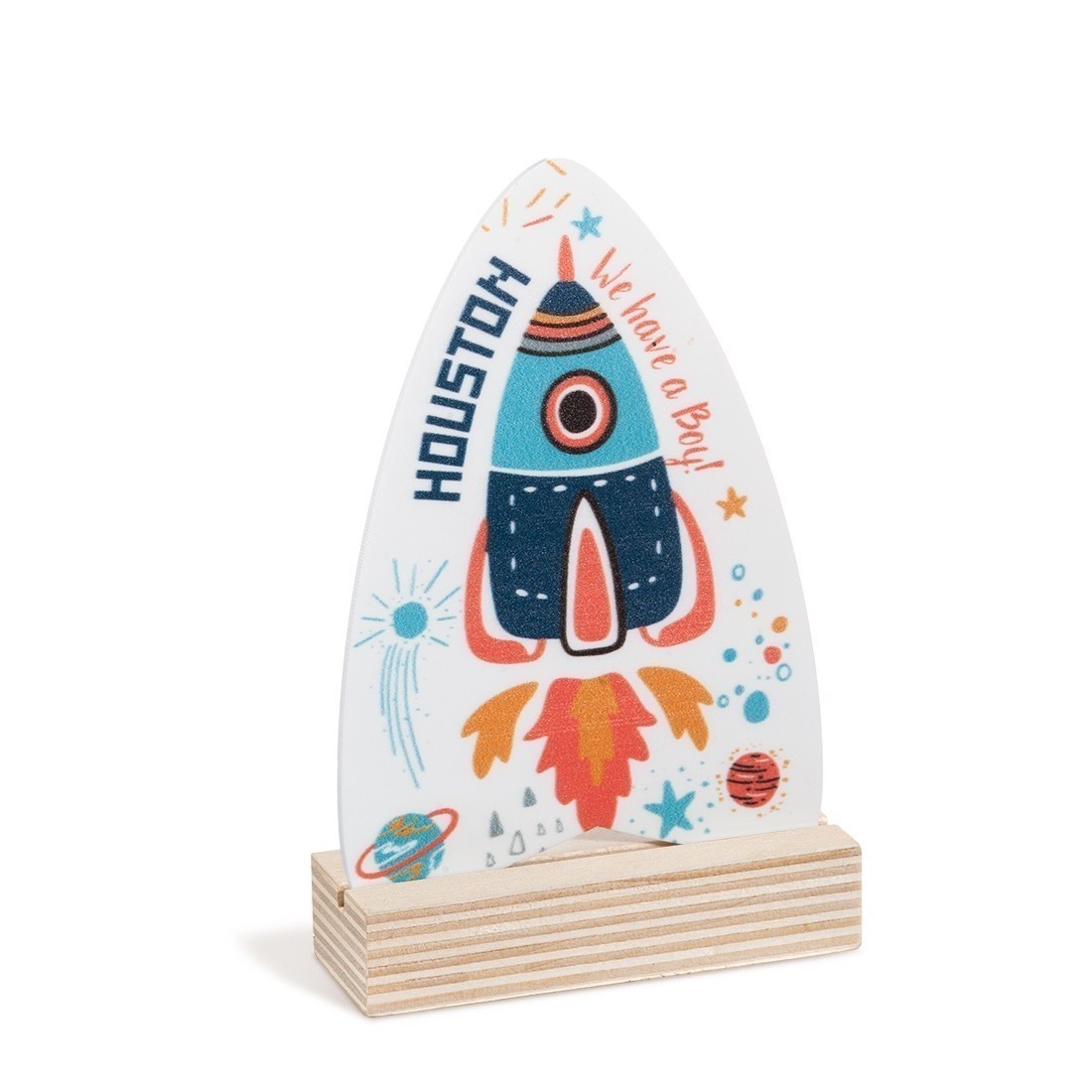 Ξύλινη βάση με print plexiglass κοπτικό. Η παράσταση απεικονίζει σε λευκό χρώμα τον πύραυλο να απογειώνεται και moto "Houston we have a boy" .