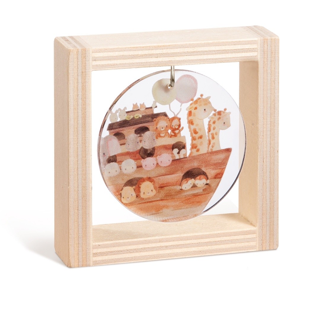 Ξύλινο τετράγωνο καδράκι με στρογγυλή print παράσταση από plexiglass σε διάφανο χρώμα. Η παράσταση απεικονίζει την κιβωτό γεμάτη ζωάκια.