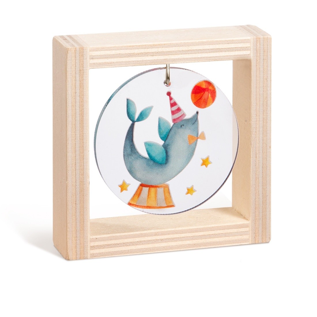 Ξύλινο τετράγωνο καδράκι με στρογγυλή print παράσταση από plexiglass σε διάφανο χρώμα. Η παράσταση απεικονίζει το δελφίνι να κάνει ακροβατικά στο τσίρκο.