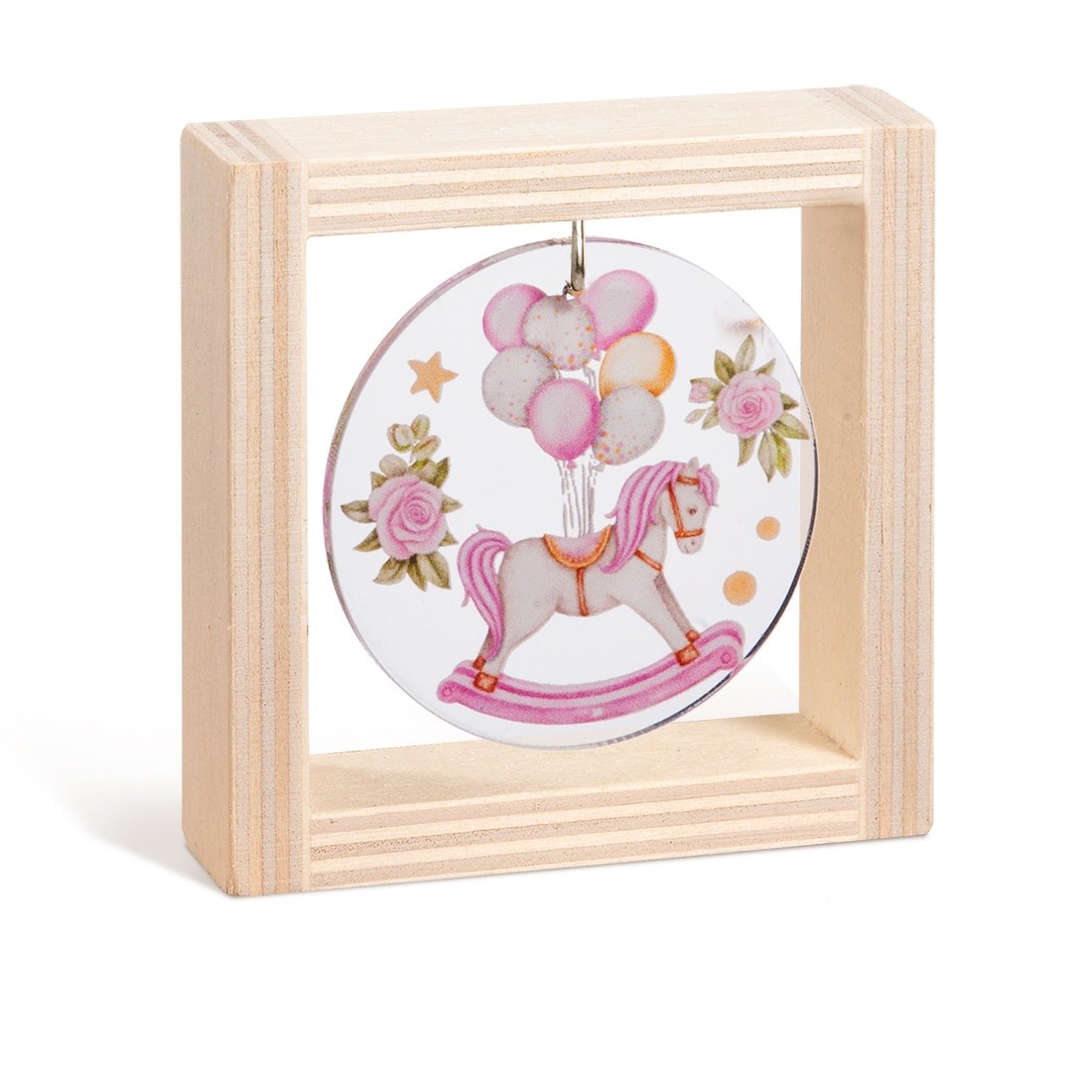 Ξύλινο τετράγωνο καδράκι με στρογγυλή print παράσταση από plexiglass σε διάφανο χρώμα. Η παράσταση απεικονίζει ένα ροζ αλογάκι με μπαλόνια.