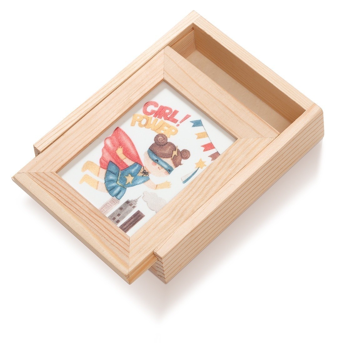 Ξύλινη κασετίνα με κορνίζα,Η κορνίζα είναι διακοσμημένη με παραλληλόγραμμο print plexiglass καδράκι σε λευκό χρώμα.Η παράσταση απεικονίζει σε κάθετη μορφή την Super Girl power.