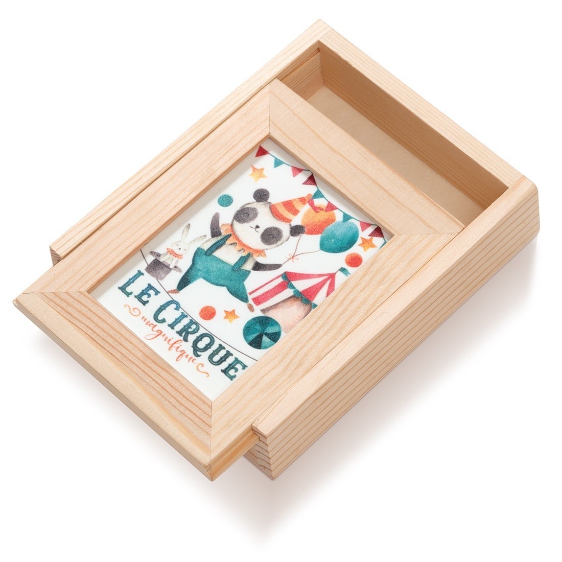 Ξύλινη κασετίνα με κορνίζα. Η κορνίζα είναι διακοσμημένη με παραλληλόγραμμο print plexiglass καδράκι σε λευκό χρώμα. Η παράσταση απεικονίζει σε κάθετη μορφή το panda να κάνει ακροβατικά με φόντο τη σκηνή του τσίρκου.