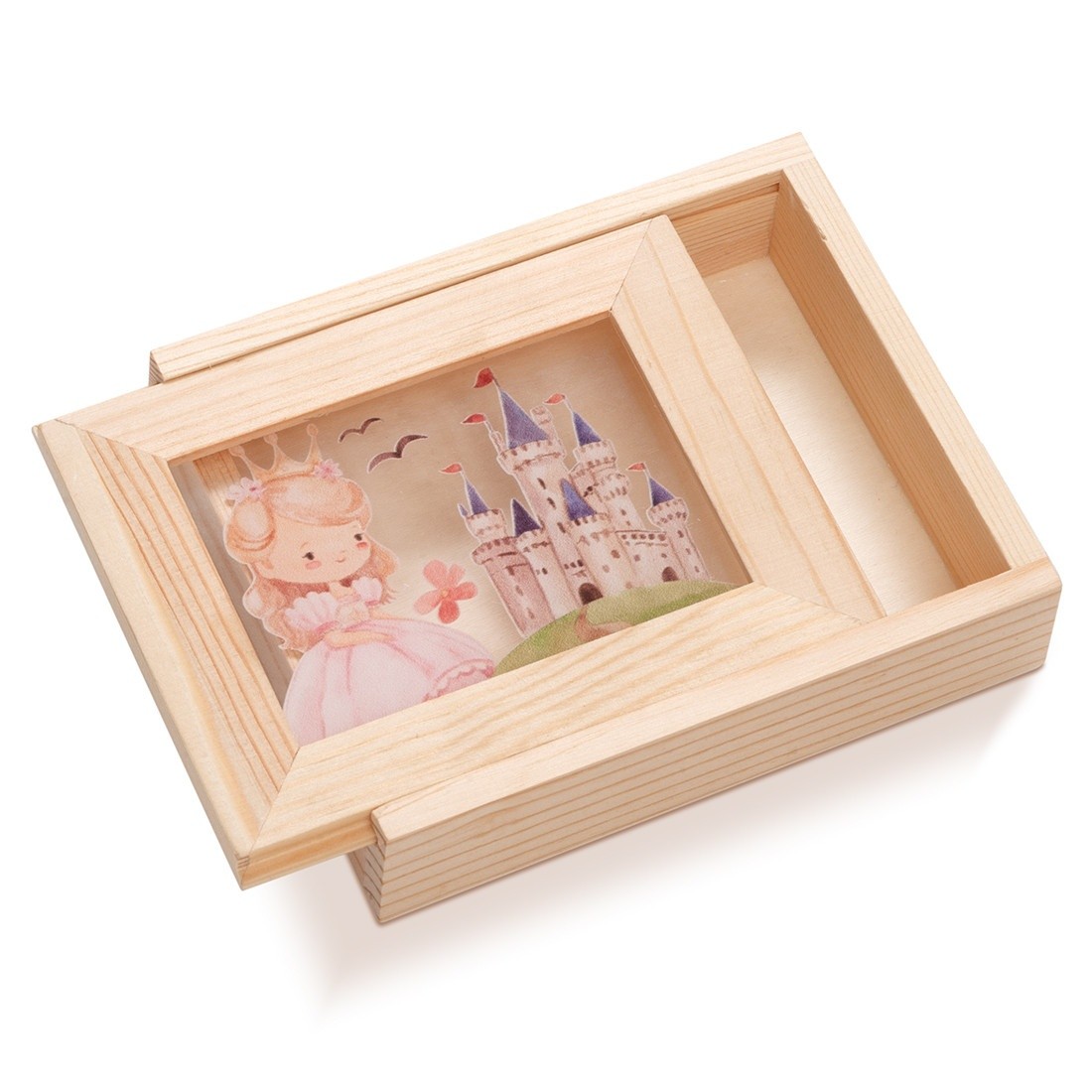 Ξύλινη κασετίνα με κορνίζα,Η κορνίζα είναι διακοσμημένη με παραλληλόγραμμο print plexiglass καδράκι σε διάφανο χρώμα.Η παράσταση απεικονίζει σε οριζόντια μορφή την πριγκίπισσα του παραμυθιού με φόντο το κάστρο.