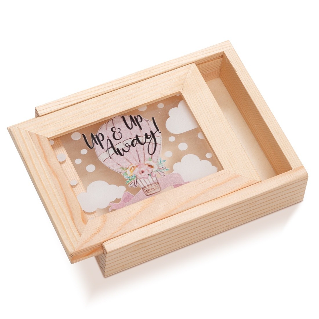 Ξύλινη κασετίνα με κορνίζα,Η κορνίζα είναι διακοσμημένη με παραλληλόγραμμο print plexiglass καδράκι σε διάφανο χρώμα.Η παράσταση απεικονίζει σε οριζόντια μορφή το αερόστατο σε ροζ χρώμα και moto "up, up & away"