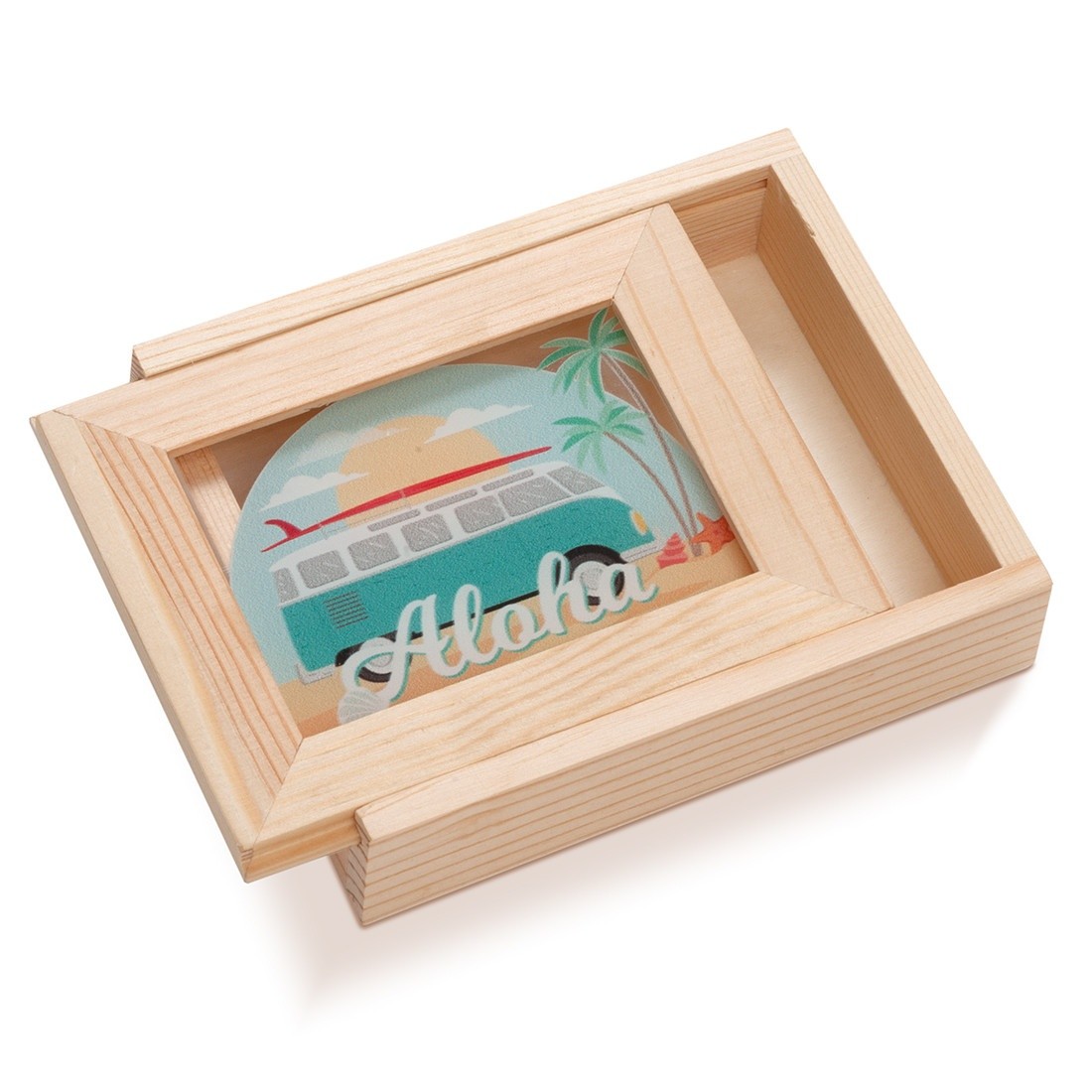 Ξύλινη κασετίνα με κορνίζα,Η κορνίζα είναι διακοσμημένη με παραλληλόγραμμο print plexiglass καδράκι σε διάφανο χρώμα.Η παράσταση απεικονίζει σε οριζόντια μορφή ένα βεραμάν van ALOHA .