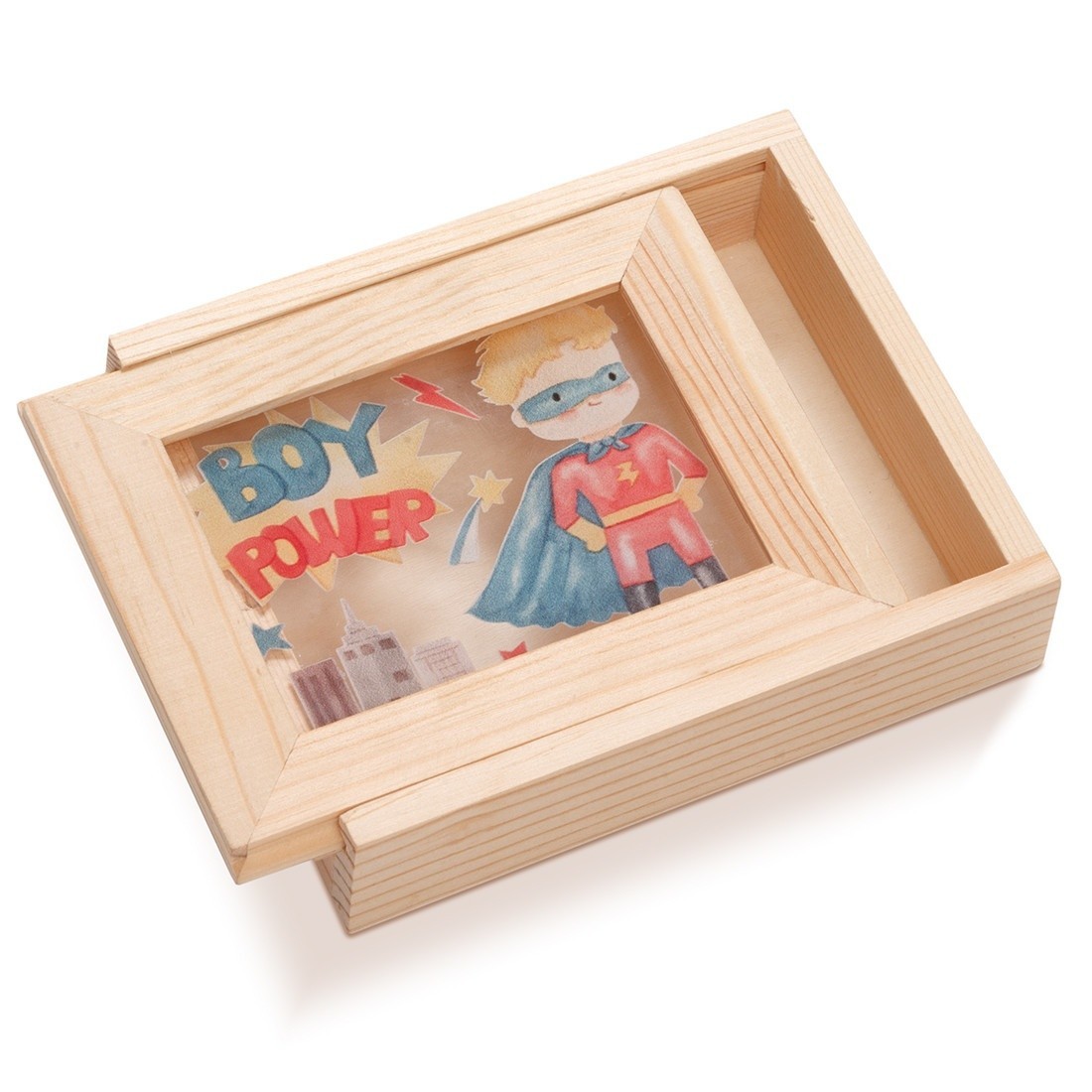 Ξύλινη κασετίνα με κορνίζα,Η κορνίζα είναι διακοσμημένη με παραλληλόγραμμο print plexiglass καδράκι σε διάφανο χρώμα.Η παράσταση απεικονίζει σε οριζόντια μορφή το Super boy Power.