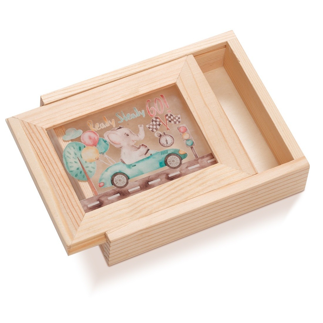 Ξύλινη κασετίνα με κορνίζα,Η κορνίζα είναι διακοσμημένη με παραλληλόγραμμο print plexiglass καδράκι σε διάφανο χρώμα.Η παράσταση απεικονίζει σε οριζόντια μορφή το ελεφαντάκι να συμμετέχει σε αγώνες φόρμουλας και σύνθημα "READY, STEADY, GO".