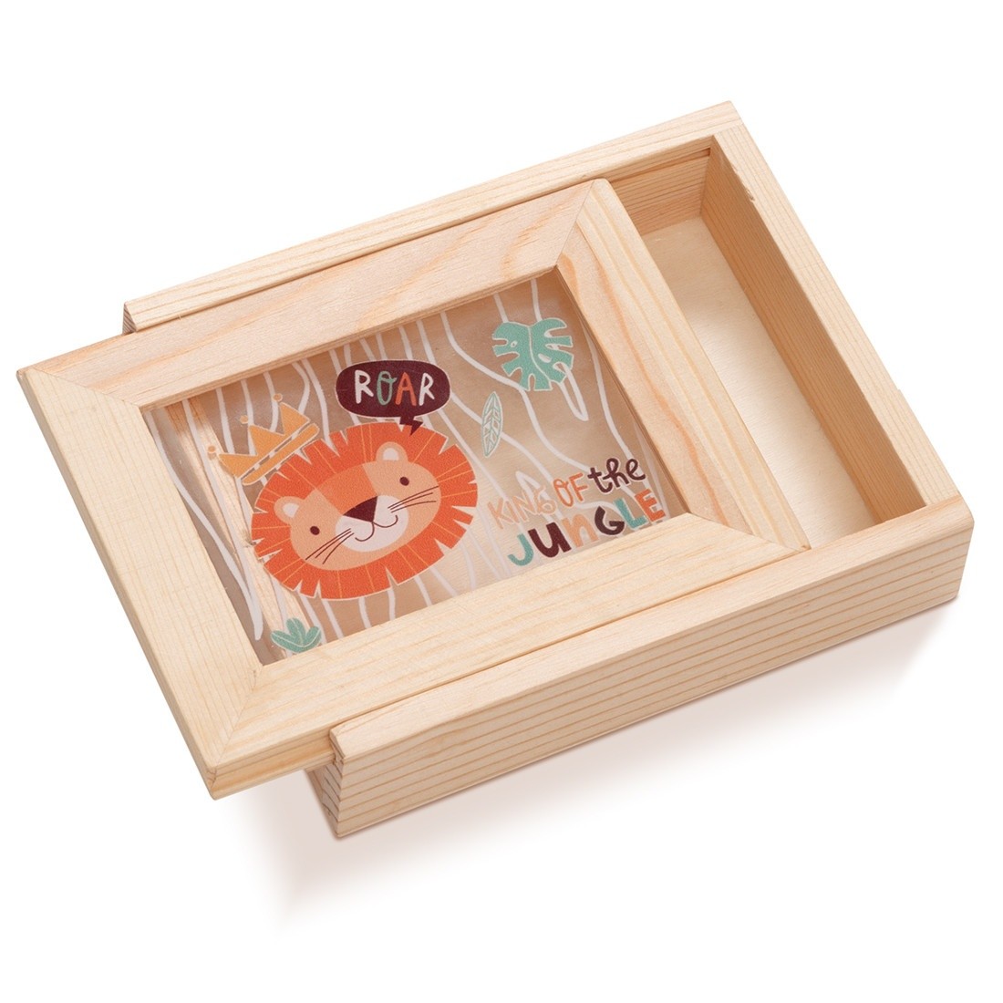 Ξύλινη κασετίνα με κορνίζα,Η κορνίζα είναι διακοσμημένη με παραλληλόγραμμο print plexiglass καδράκι σε διάφανο χρώμα.Η παράσταση απεικονίζει σε οριζόντια μορφή το λιονταράκι ως "King of the jungle".