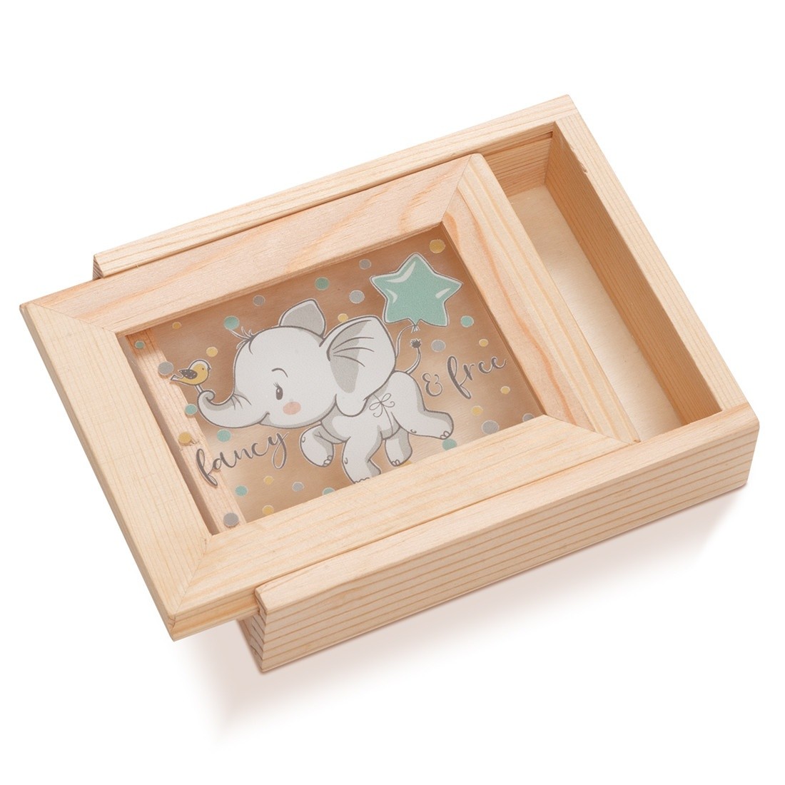 Ξύλινη κασετίνα με κορνίζα,Η κορνίζα είναι διακοσμημένη με παραλληλόγραμμο print plexiglass καδράκι σε διάφανο χρώμα.Η παράσταση απεικονίζει σε οριζόντια μορφή το ελεφαντάκι με το μπαλόνι να είναι fancy & free.
