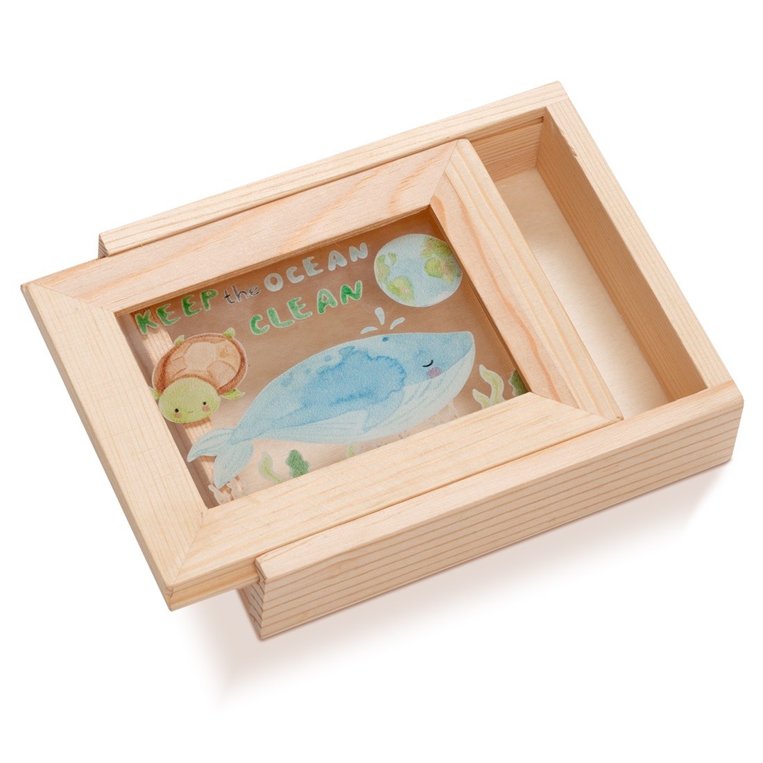 Ξύλινη κασετίνα με κορνίζα,Η κορνίζα είναι διακοσμημένη με παραλληλόγραμμο print plexiglass καδράκι σε διάφανο χρώμα.Η παράσταση απεικονίζει σε οριζόντια μορφή το βυθό και σύνθημα "Keep the Ocean Clean".