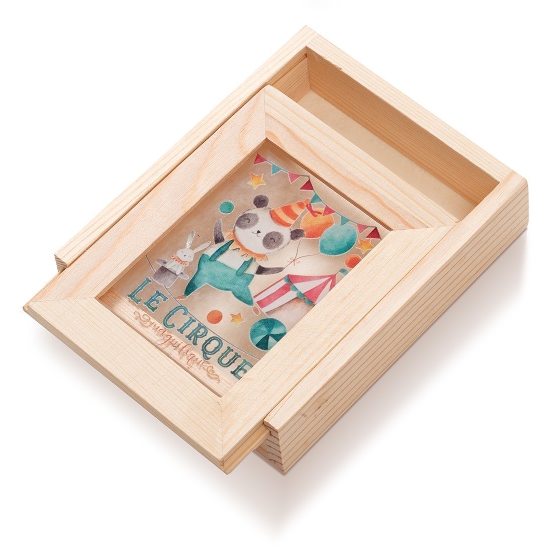 Ξύλινη κασετίνα με κορνίζα,Η κορνίζα είναι διακοσμημένη με παραλληλόγραμμο print plexiglass καδράκι σε διάφανο χρώμα.Η παράσταση απεικονίζει σε κάθετη μορφή το panda να κάνει ακροβατικά με φόντο τη σκηνή του τσίρκου.