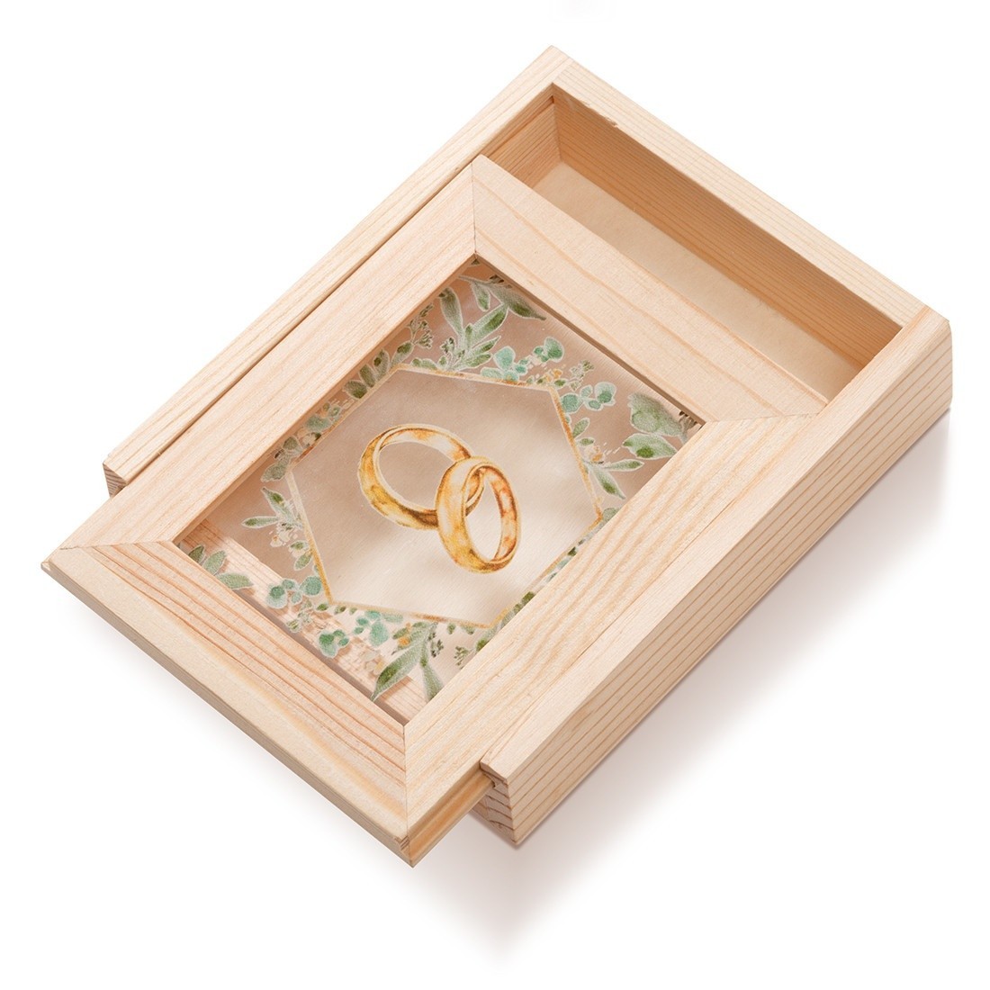Ξύλινη κασετίνα με κορνίζα,Η κορνίζα είναι διακοσμημένη με παραλληλόγραμμο print plexiglass καδράκι σε διάφανο χρώμα.Η παράσταση απεικονίζει σε κάθετη μορφή χρυσές βέρες μέσα σε ένα στεφανάκι από πράσινο ευκάλυπτο.