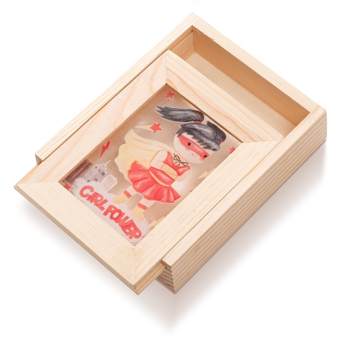 Ξύλινη κασετίνα με κορνίζα,Η κορνίζα είναι διακοσμημένη με παραλληλόγραμμο print plexiglass καδράκι σε διάφανο χρώμα.Η παράσταση απεικονίζει σε κάθετη μορφή την Super Girl power.