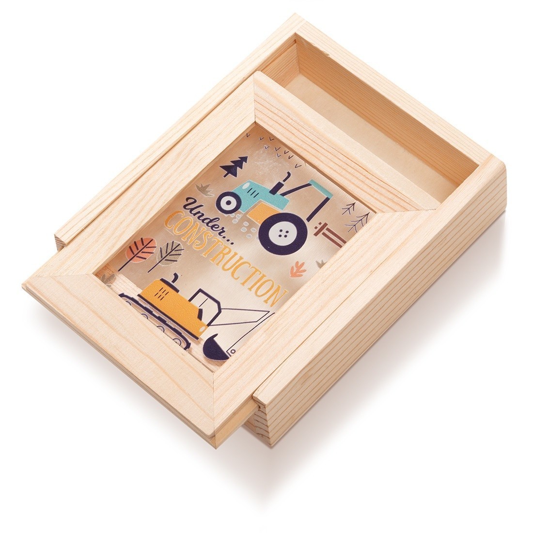 Ξύλινη κασετίνα με κορνίζα,Η κορνίζα είναι διακοσμημένη με παραλληλόγραμμο print plexiglass καδράκι σε διάφανο χρώμα.Η παράσταση απεικονίζει σε κάθετη μορφή τον εκσκαφέα και το τρακτέρ.