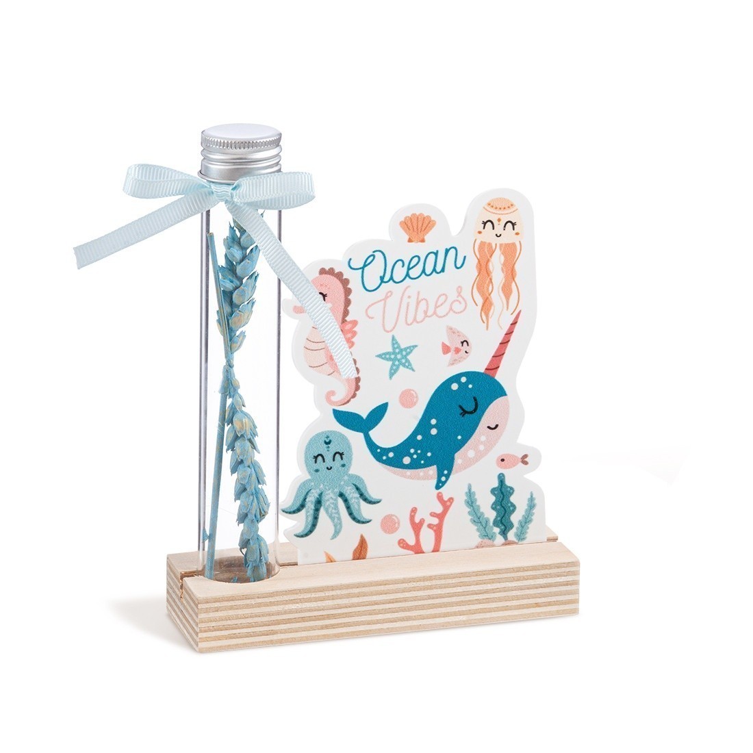 Ξύλινη βάση με print καδράκι plexiglass σε λευκό χρώμα και γυάλινο δοκιμαστικό σωλήνα.Η παράσταση σε σχήμα απεικονίζει το βυθό με τη φάλαινα, τη μέδουσα, το χταπόδι και τον ιππόκαμπο σε "Ocean Vibes".