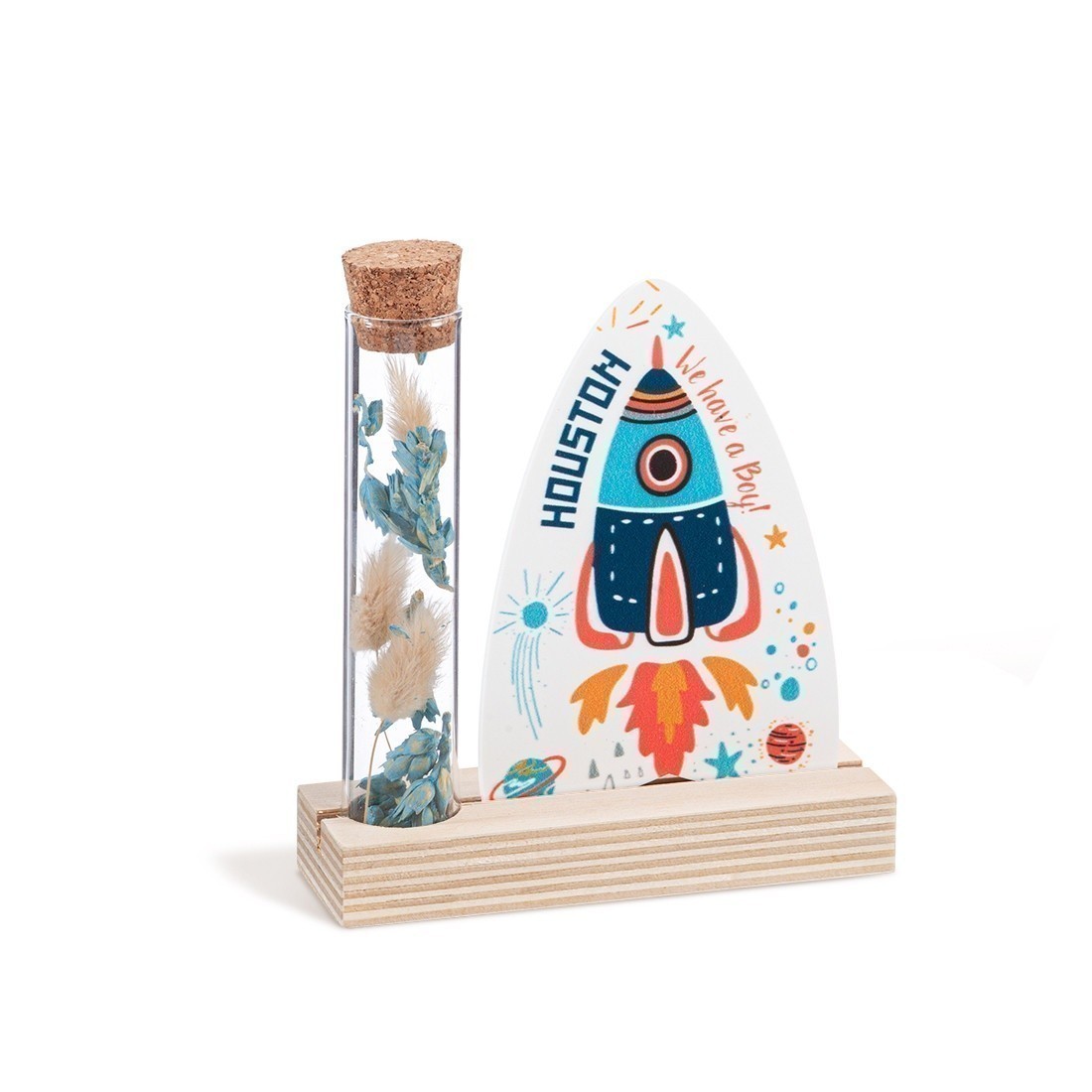 Ξύλινη βάση με print καδράκι plexiglass σε λευκό χρώμα και γυάλινο δοκιμαστικό σωλήνα.Η παράσταση σε σχήμα πύραυλου και απεικονίζει τον πύραυλο να απογειώνεται και moto "Houston we have a boy".