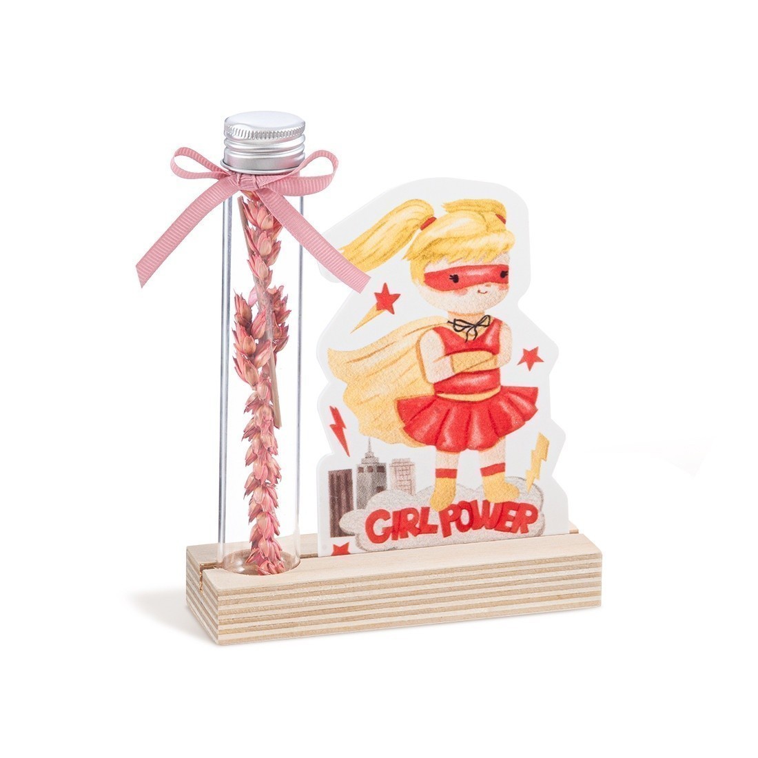 Ξύλινη βάση με print καδράκι plexiglass σε λευκό χρώμα και γυάλινο δοκιμαστικό σωλήνα.Η παράσταση απεικονίζει την Super Girl power.