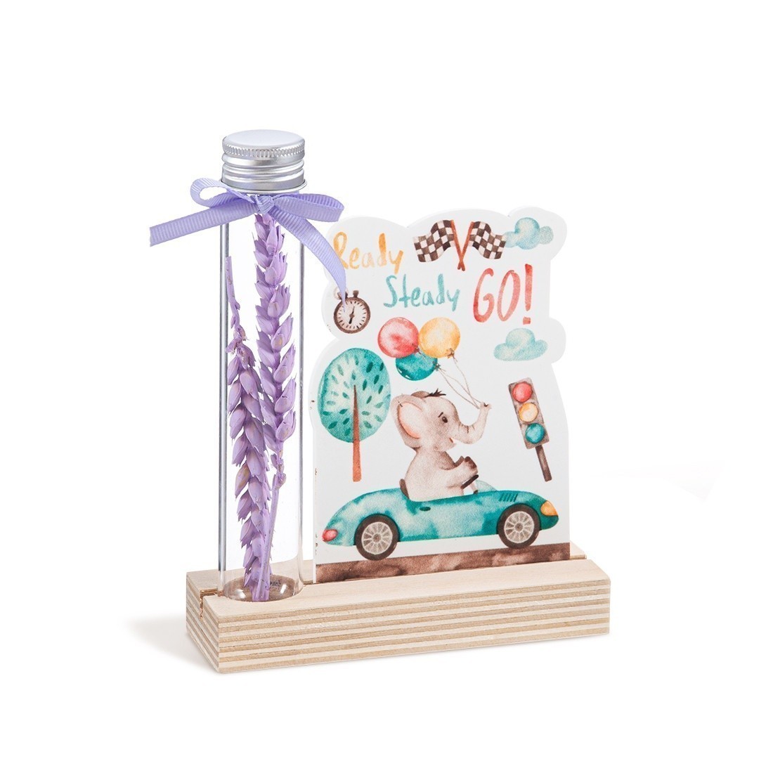 Ξύλινη βάση με print καδράκι plexiglass σε λευκό χρώμα και γυάλινο δοκιμαστικό σωλήνα.Η παράσταση απεικονίζει το ελεφαντάκι να συμμετέχει σε αγώνες φόρμουλας και σύνθημα "READY, STEADY, GO".
