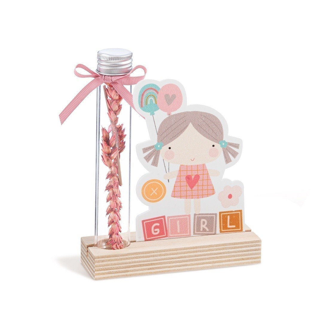 Ξύλινη βάση με print καδράκι plexiglass σε λευκό χρώμα και γυάλινο δοκιμαστικό σωλήνα.Η παράσταση απεικονίζει ένα κοριτσάκι σε ροζ girlish αποχρώσεις.