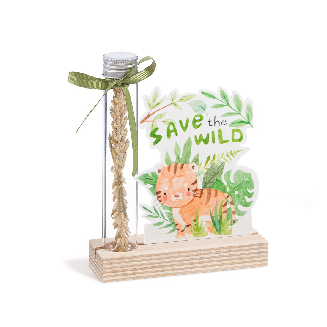 Ξύλινη βάση με print καδράκι plexiglass σε λευκό χρώμα και γυάλινο δοκιμαστικό σωλήνα.Η παράσταση απεικονίζει την τίγρη μέσα σε πράσινα φυλλώματα να στέλνει το μήνυμα "Save the wild".