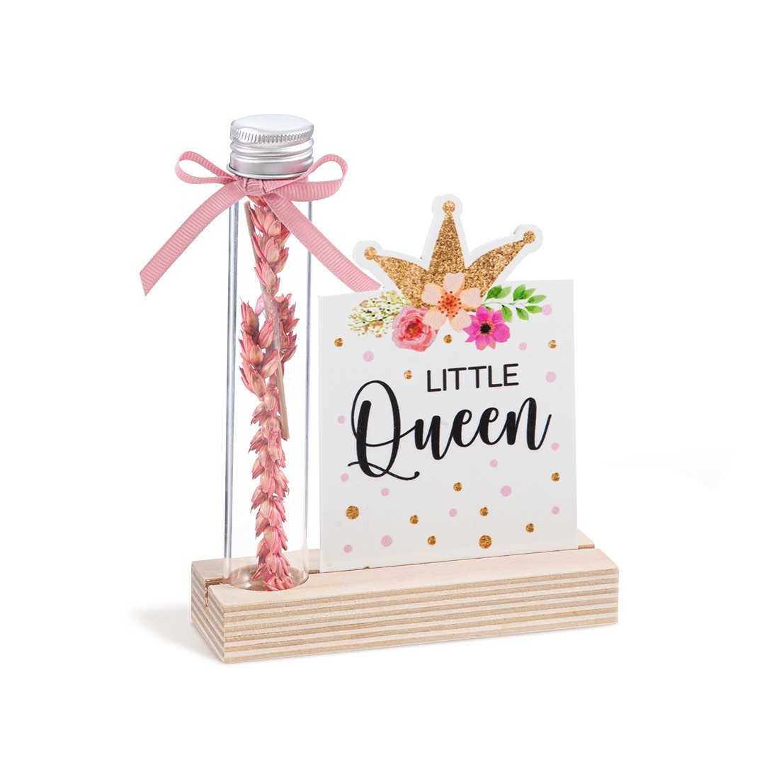 Ξύλινη βάση με print καδράκι plexiglass σε λευκό χρώμα και γυάλινο δοκιμαστικό σωλήνα.Η παράσταση απεικονίζει την κορώνα της "Little Queen".